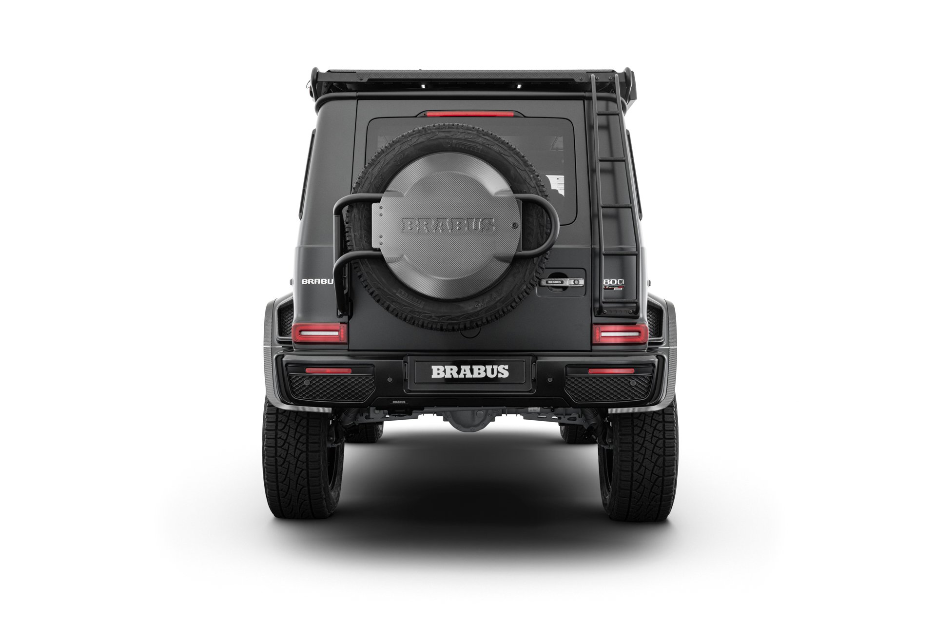 Equipped with the full range of the BRABUS Adventure program, the BRABUS 800 4x4² Edition RHD features additional standout features like the carbon fiber BRABUS wind deflector, providing both impressive looks and enhanced nighttime visibility. The BRABUS roof rack with side-mounted survival utilities offers convenient storage for heavy cargo, while the custom BRABUS rear-ladder ensures direct loading and unloading. Electronically extending BRABUS sidesteps facilitate entry and exit. The overall design is rounded off by further high-grade carbon fiber elements including BRABUS side mirror covers, BRABUS door handles as well as the BRABUS logo cover for the custom spare wheel carrier.