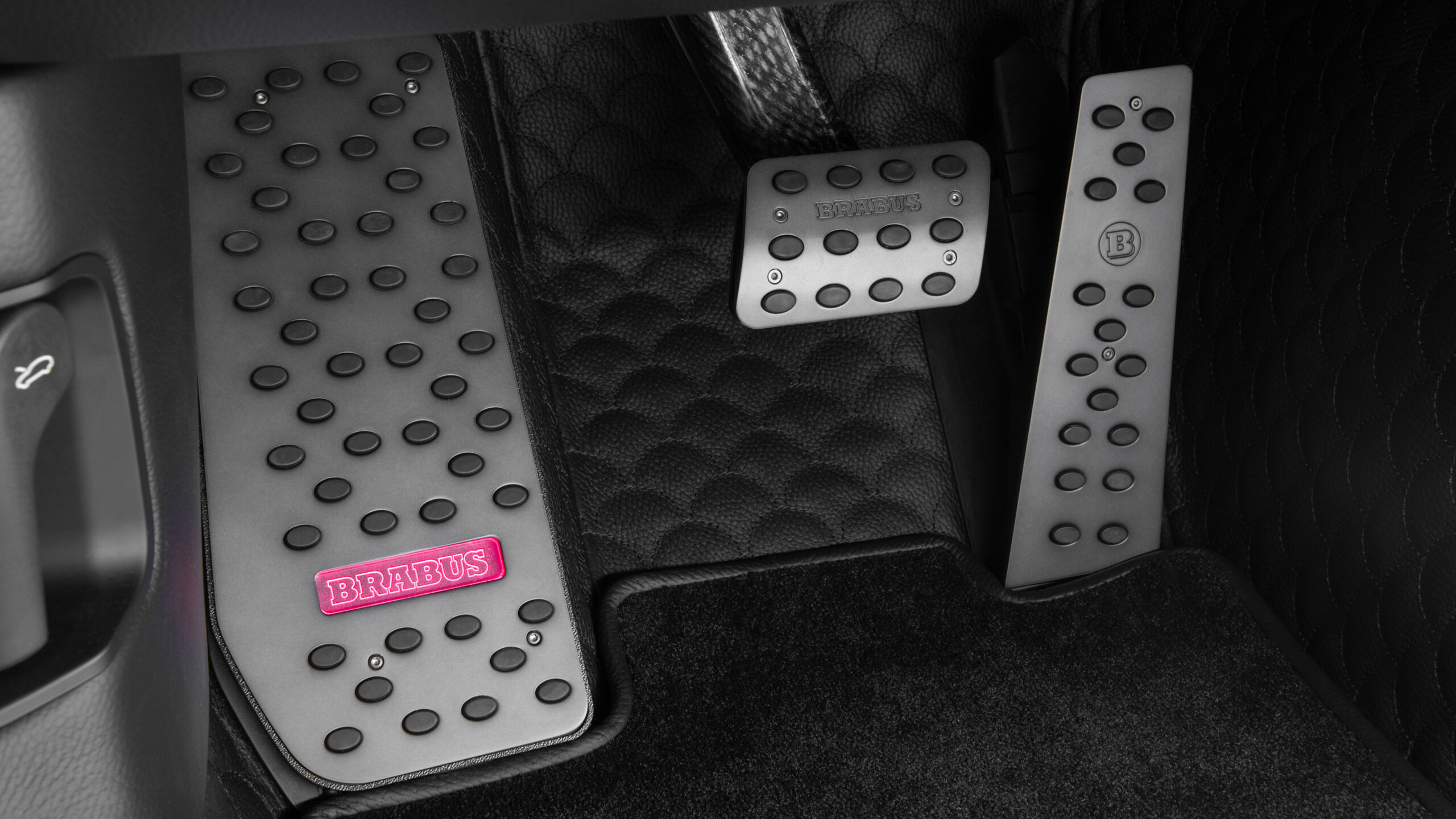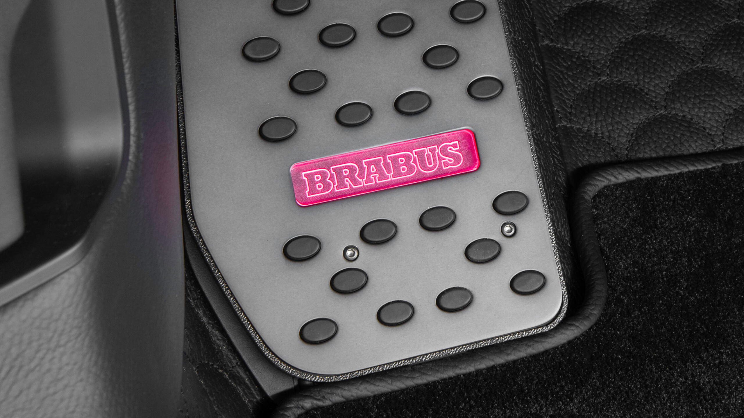 BRABUS footrest made from high-grade aluminum with a matte anodized finish and a backlit BRABUS logo, perfectly complementing the BRABUS pedal pads. Can be set to white or matched to the vehicle’s ambient interior lighting.